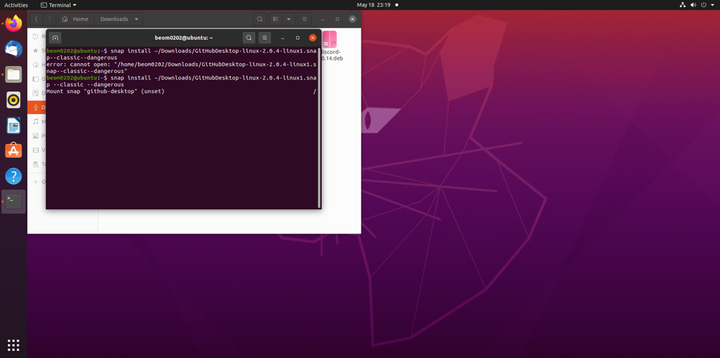 snap install ~/Downloads/GitHubDesktop-linux-2.0.4-linux1.snap –classic –dangerous